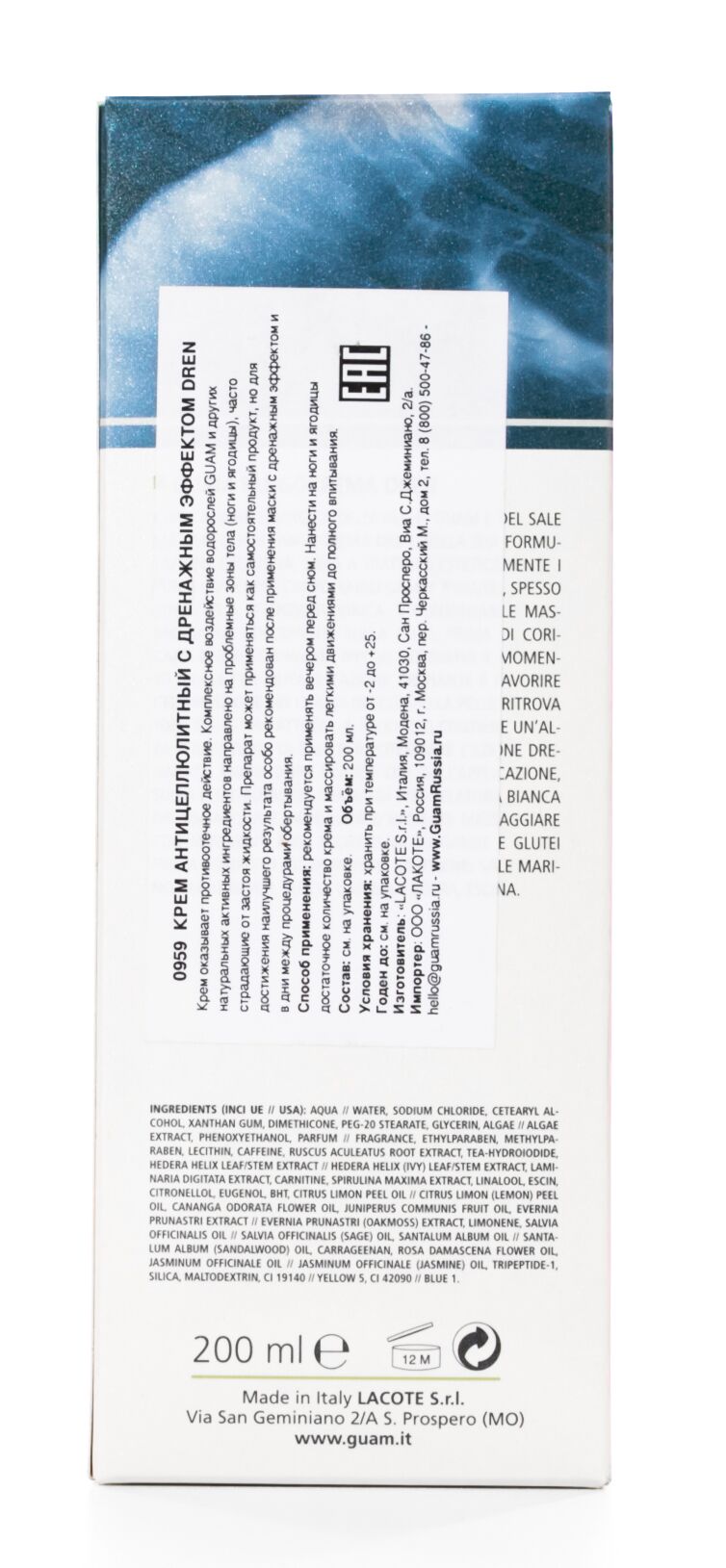 Особая формула крема на основе морских водорослей, минеральных солей и фитоэкстрактов обладает выраженным дренажным эффектом. Способствует снятию отёчности, эффективно продлевает действие дренажной маски. Активные компоненты стимулируют расщепление жиров, улучшают микроциркуляцию, разглаживают кожу и способствуют устранению целлюлита. Прекрасно подходит для закрепления процедуры обёртывания. Мягкими движениями наносить на кожу перед сном. Экстракт водорослей GUAM, кофеин, карнитин, экстракт плюща, экстракт иглицы шиповитой, эсцин.