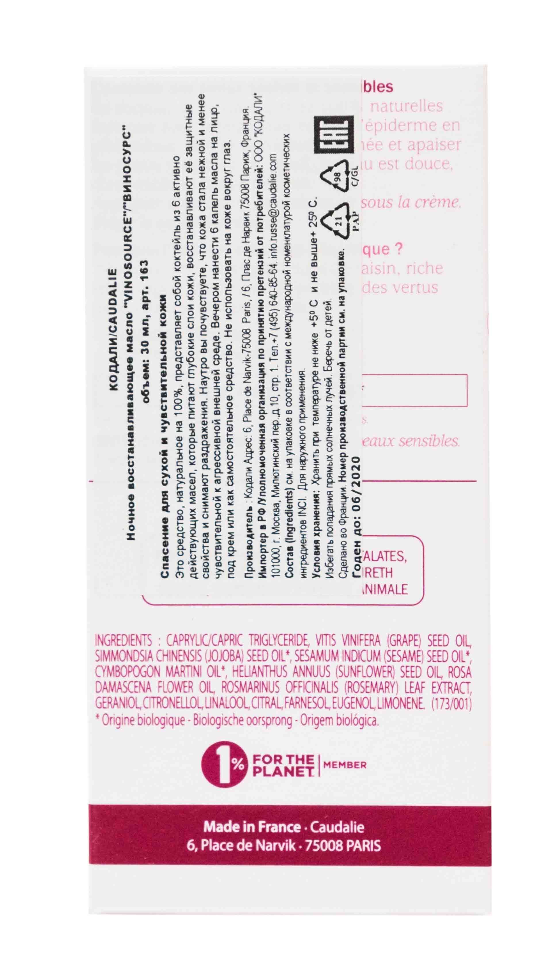 Протестировано под дерматологическим контролем. Как и во всех других продуктах Caudalie, в нем не содержится парабенов, феноксиэтанола, фталатов, минеральных масел и ингредиентов животного происхождения.