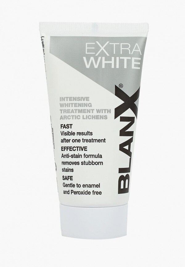 Зубная паста Blanx Extra White обеспечивает настоящую косметическую процедуру для зубов. Зубная паста, благодаря своей специальной рецептуре, обогащенной арктическими лишайниками, является эффективным и безопасным средством, которое действует на поверхность эмали, восстанавливая естественный белый цвет зубов. Преимущества зубной пасты Blanx Extra White интенсивное отбеливание -Видимые результаты с момента первого использования. -Бережное удаление глубоких пигментных пятен. -Рекомендована для тех, кто часто употребляет крепкий чай, кофе, красное вино, курильщикам. -Экстракт арктических мхов и усниновая кислота, входящие в состав пасты, препятствует размножению стрептококковых бактерий, препятствуя образованию и развитию кариеса. -Равномерное отбеливание. -Низкая абразивность – 39 RDA. -Освежает дыхание.